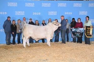 EVF Lily 338L, sired by SVY Trust 6H with her LT Countdown 9712 bull calf at side, owned by Harvie Ranching Olds, was selected Grand Champion Female at Farm Fair International November 7th in Edmonton. Judges Ryley & Jill Mader, Carstairs then selected SOS Kardashian Pld 798K, sired by BRCHE White Bear 8505 Pld ET and her TR CAG Carbon Copy 7630 ET heifer calf, exhibited by Pinnacle View Livestock, Quesnel, BC & Springside Cattle Co., Airdrie as the Reserve Grand Champion Female of this entry 90 entry BOSS show. The Grand Champion Bull was KAY-R Tremor 7015L, sired by RBM Keystone H41 exhibited by KFC Farms, Didsbury & Kay-R Land & Cattle Ltd., Waskatenau. The Reserve Grand Champion Bull was PCC Stock 507N, sired by Sparrows McLellend 314L exhibited by Prairie Cove Charolais, Bashaw and W2 Farms, Lanigan, SK.