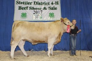 Addison Charbonneau from the Byemoor, AB 4-H Beef Club won Grand Champion of the Byemoor Club and Res. Grand Champion at the Stettler Regional Show with her steer Traveller. The show on May 23rd was judged by Bill Dietrich. The steer weighing 1,262 lb sold for $3.15/lb to Springside Farms, Airdrie.