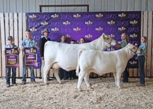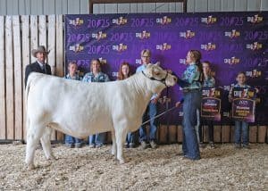 Indy Fowler, Bashaw had Grand Champion Female at the 2025 Canadian Charolais Youth Association Conference and Show, July 19th in Stettler, AB with Miss Prairie Cove 417M by WCR Bold Move168 P.